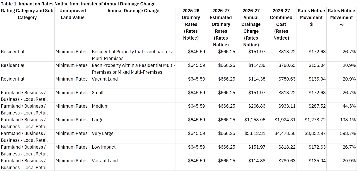 To maintain funding for essential stormwater drainage services, Council proposes to apply a Drainage Charge to the rate notice under the Local Government Act 1993 for ratepayers who currently pay the charge.